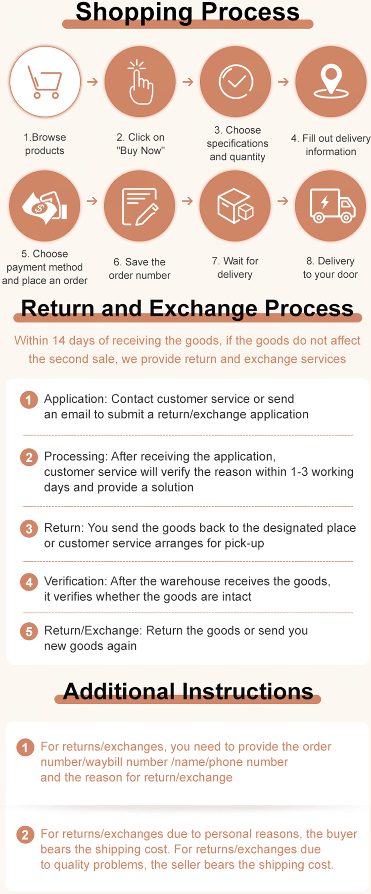 4. DesireKit.com will not be liable for the products returned by mistake. If an extra or a different product is returned by mistake, DesireKit.com would not be accountable for misplacement or replacement of the product and is not responsible for its delivery back to the Customer.